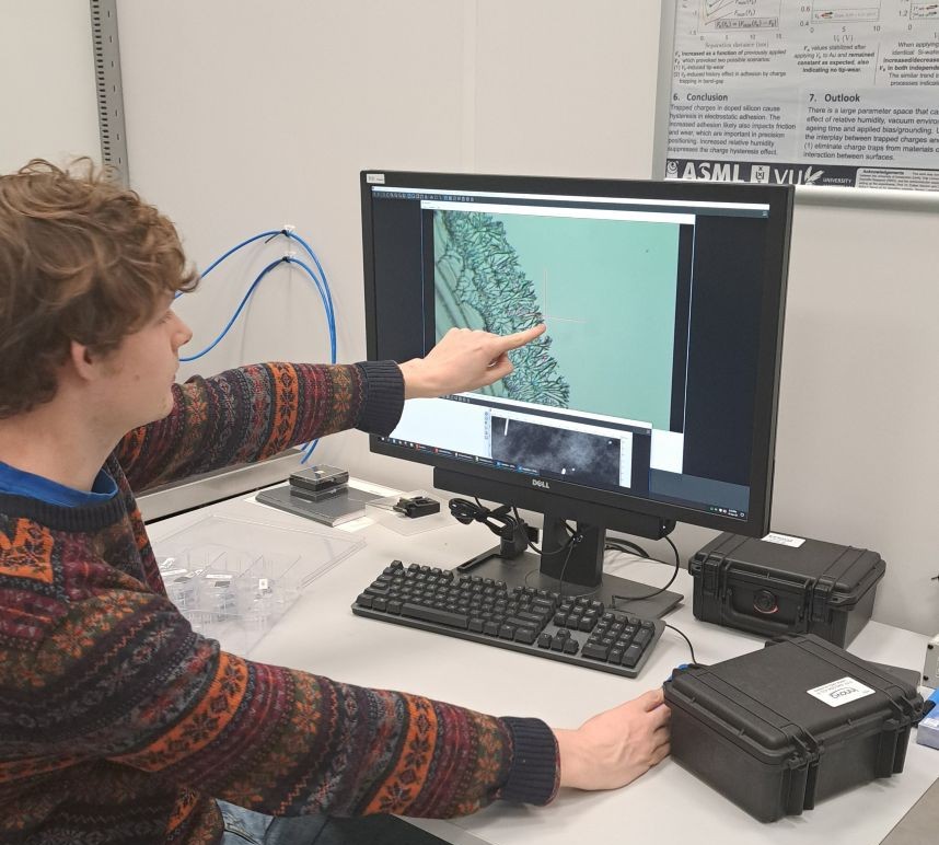 During his MSc project, ARCNL PhD candidate Tijn Vernooij discovered that calcium sulfate, a widely used material, could be used in the form of thin nanocrystals to reduce friction between silicon surfaces. Now published in the journal Wear, his study forms the starting point for his PhD and for developing longer-lasting precision positioners for semiconductor manufacturing processes.