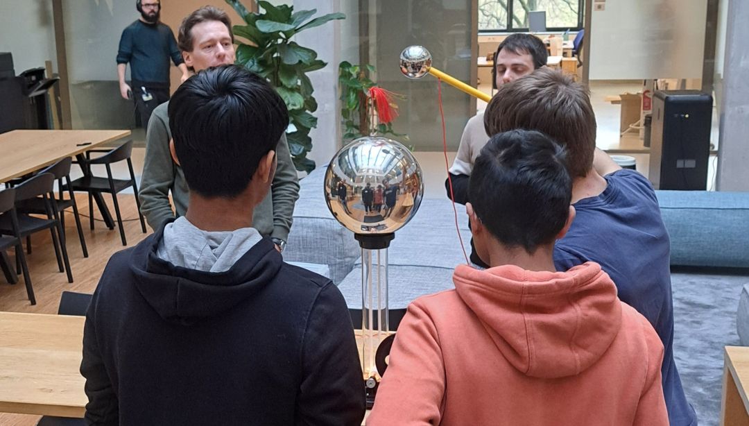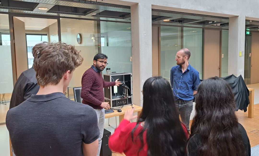 In the afternoon, a group of about 20 students and teachers arrived at ARCNL, where they saw an introductory talk by our institute manager Marjan Fretz. Then, the group visited lab tours and demonstrations hosted by ARCNL researchers. Four labs hosted tours, including Oscar’s own lab. The visitors enjoyed seeing where real research happens, as well as being able to choose between labs to visit. At the same time, on the demonstration floor, students experienced static electricity with a Van de Graaff generator, measured the friction in their shoes, saw how light waves rotate, and learned how liquid droplets can be controlled.